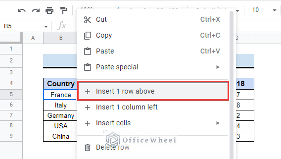 - Then, right-click on the mouse to see the context menu. And, choose Insert 1 row above from there.