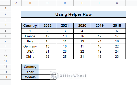 - Now, insert the below-mentioned formula in cell C14. And give a Country name and Year input in the blank cells. You will get the medal number in C14.