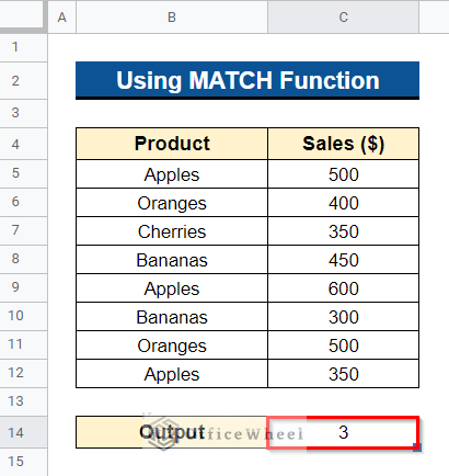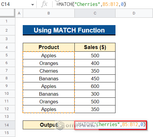 =MATCH("Apples",B5:B12,0)- The specific text we were looking for is present in the 3rd row. It will show you the result of the first occurrence of your specific text.