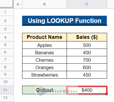 =LOOKUP("Bananas",B5:B9,C5:C9)- Now, press the Enter button and it will show you the sales of the product you searched for.