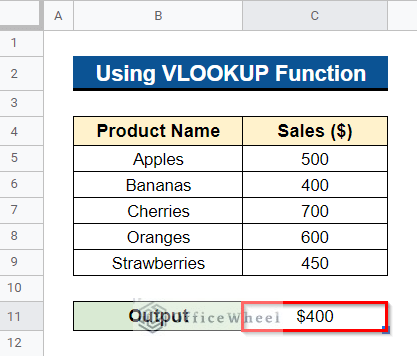 =VLOOKUP("Bananas",B5:C9,2)- As soon as you press the Enter key, the product’s sales will be shown.