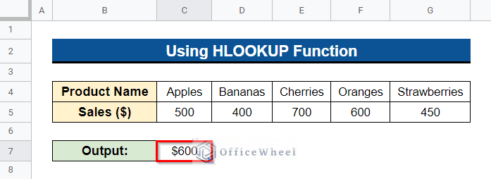 =HLOOKUP("Oranges",C4:G5,2)- Now, pressing the Enter key will display the product’s sales data.
