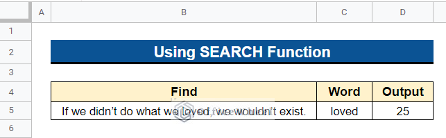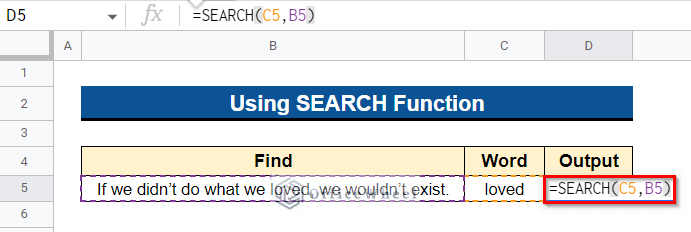 =SEARCH(C5,B5)- Finally, it will show you the position of the specific text within the cell string.
