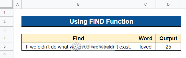 =FIND(C5,B5)- Finally, it will display where in the cell string the particular text is located.