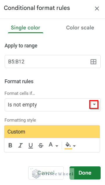 - The Conditional format rules dialog box will open up. Click on the drop-down icon in Format cells if… box.