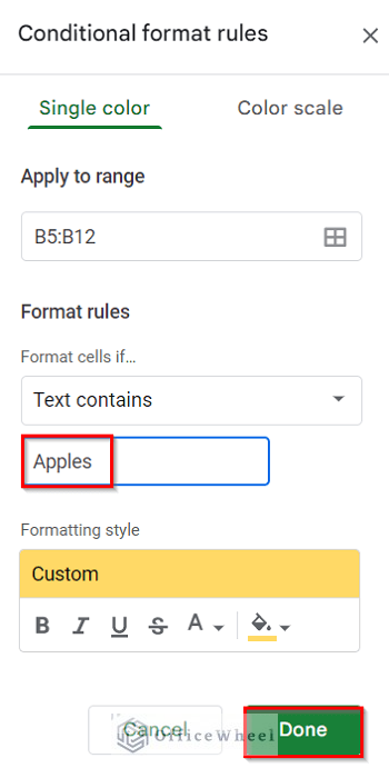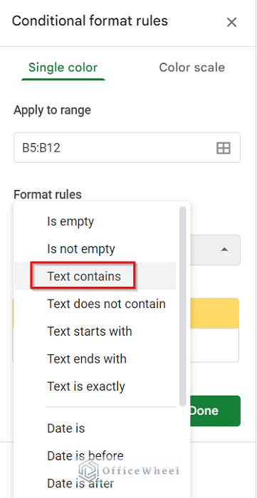 We can use Google Sheets’ Conditional Formatting feature to search for text in range. You can search for specific text and highlight it by color using this feature.