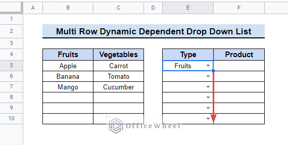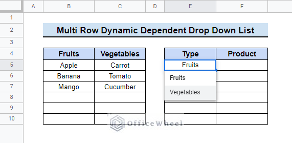 =ArrayFormula(IF(LEN(E5:E10),TRANSPOSE(IF(TRANSPOSE(E5:E10)=B4,INDIRECT("Fruits"),IF(TRANSPOSE(E5:E10)=C4,INDIRECT("Vegetables")))),""))- Then it will show the values for the dependent dropdown in cells starting from cell H5.