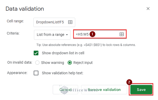 - First, select cell F5 and then go to Data >> Data validation as earlier. Then choose List from a range as the validation criteria. Next, enter H5:W5 as the criteria range and click Save.