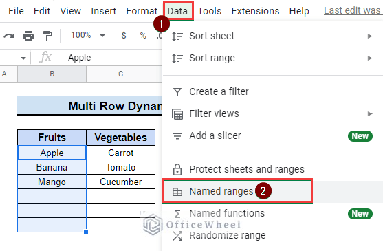 - Then, from the top menu bar, click on Data. Next, a dropdown list will appear. Now select Named ranges from there.