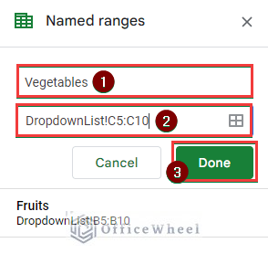 - This will open a pane titled Named ranges on the right side of the spreadsheet. Then change the default name Named Range to Fruits. In the following box, the range will show your previously selected range DropdownList!B5:B10. Now click on the Done button.