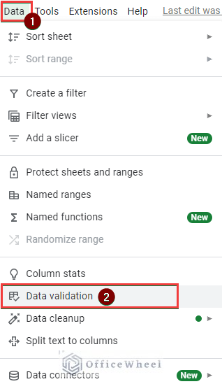 - Then select Data from the top menu bar to open the dropdown. Choose Data validation from there.