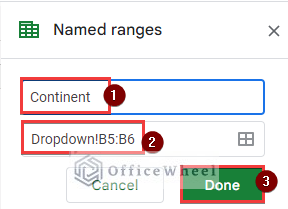 - Next type Continent in the name field and enter B5:B6 into the range filed below. You can also select the range by clicking on the icon there. Here range B5:B6 contains the list of continents.