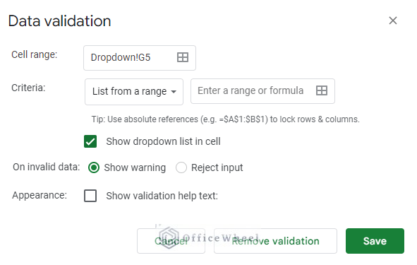 - After that, select the checkbox for Show drop down from the list, the radio button for Reject input, and then click Save to apply the Data validation.