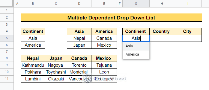 Consider the following image showing three dropdown lists. The dropdown list for Country is dependent on the selection in the dropdown list for Continent. Similarly, the dropdown list for City is dependent on the selection in the dropdown list for Country. Follow the step-by-step procedure below to create multiple dependent dropdown list in Google Sheets like this.